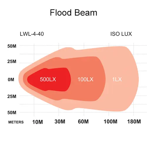 The flood beam pattern angle is about 45 degrees and you get a good light over 100mtrs.